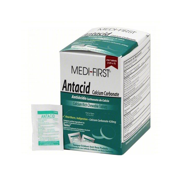 Great deal on portable antacid tablets. Use for the relief of heartburn, sour stomach, acid indigestion, and upset stomach. These antacid packets are great to carry in your purse, wallet, survival (first aid) kit, glove box, or even your pocket. Active Ingredient: Calcium Carbonate 420 mg. You get 125 individual packs with 2 tablets in each pack.