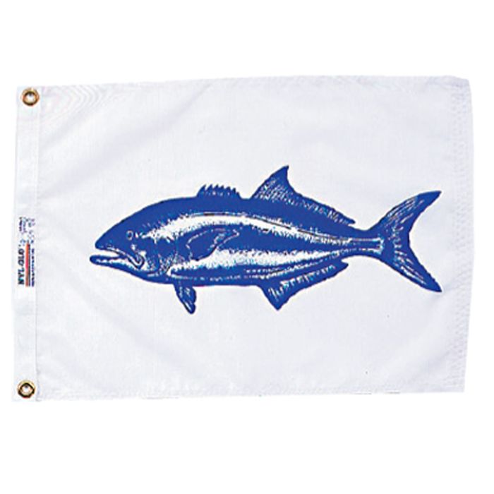 Fish flags. 100% nylon. Use indoors and out. Canvas heading and brass grommets. Clamshell packaging