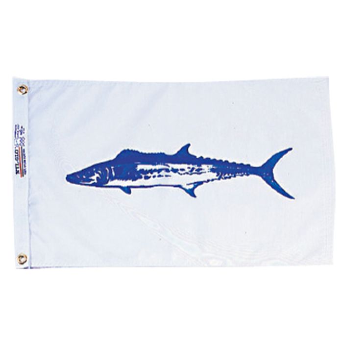 Fish flags. 100% nylon. Use indoors and out. Canvas heading and brass grommets. Clamshell packaging