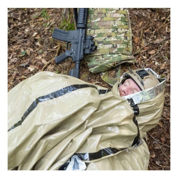 The TacMed™ Emergency Bivvy provides an emergency shelter in a small, compact, and tough package. The TacMed™ Bivvy is made with a revolutionary material that is tough enough for any mission, yet light and compact enough to take up minimal room in an aid bag, go bag, or even a cargo pocket. The Bivvy's outside surface is coyote brown for concealment while the inside surface has a thermally efficient heat-reflective coating. There are taped Velcro closures for head-to-toe maximum heat retention. The Bivvy can also be used for emergency patient warming.