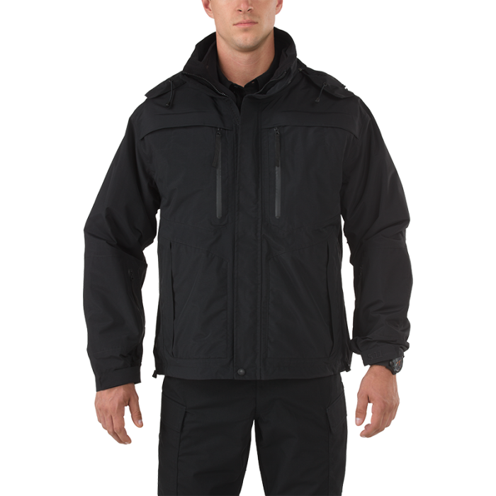 MN WOVEN 100% NYLON W/R OUTER / KNIT 100% POLYESTER INNER JKT Built on our traditional 5-in-1 jacket design, the Valiant Duty Jacket features a modular design with zip-off sleeves and a vest option, allowing you to adapt your duty wear to your environment. Elasticized cuffs offer a comfortable and secure fit, while our patented 5.11® Quixip® System ensures quick, reliable, and unhindered access to your firearm at all times. Additional features include a blood-borne pathogen resistant* liner and a roll-away hood with an integrated visor to keep you comfortable and alert in poor weather conditions.