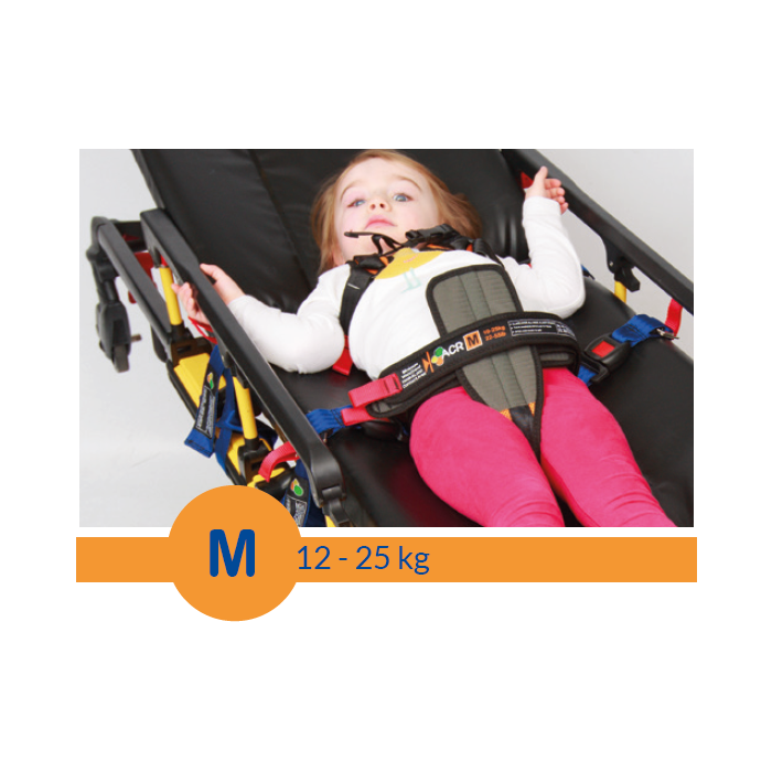 ACR is colour coded for easy selection in four sizes from 2kg to 45kg, which makes it the broadest weight range of any dedicated paediatric harness in the world. Quick release clips dock with the ACR harness, holding the patient in place to prevent potentially dangerous movement during transportation.