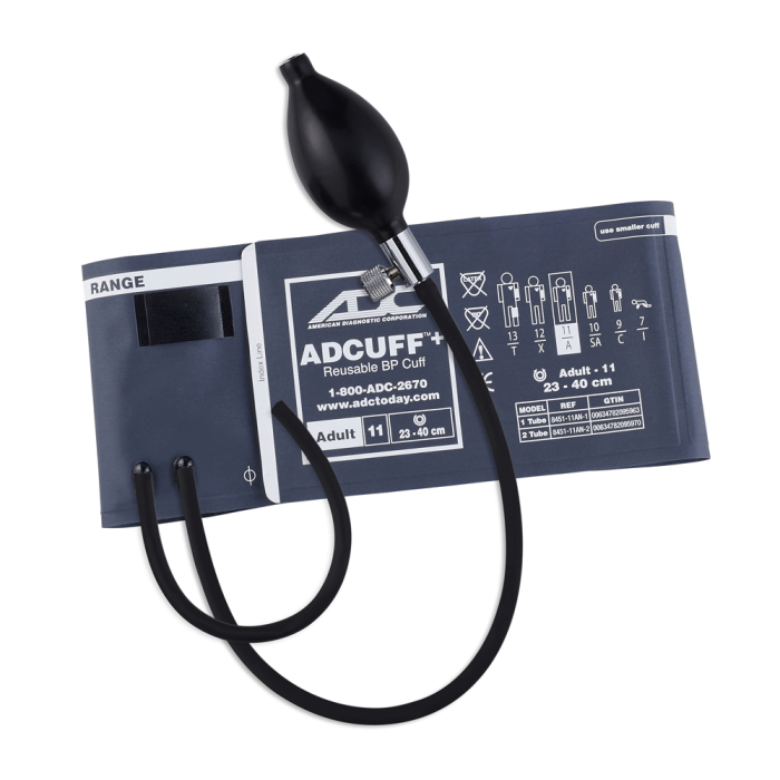 Adcuff sphyg inflation system can be used with most clock aneroids and mercurial instruments. The Adcuff+ model comes with two tubes and an Adflow bulb and valve, and features our all-new, one-piece, reusable nylon blood pressure cuff: