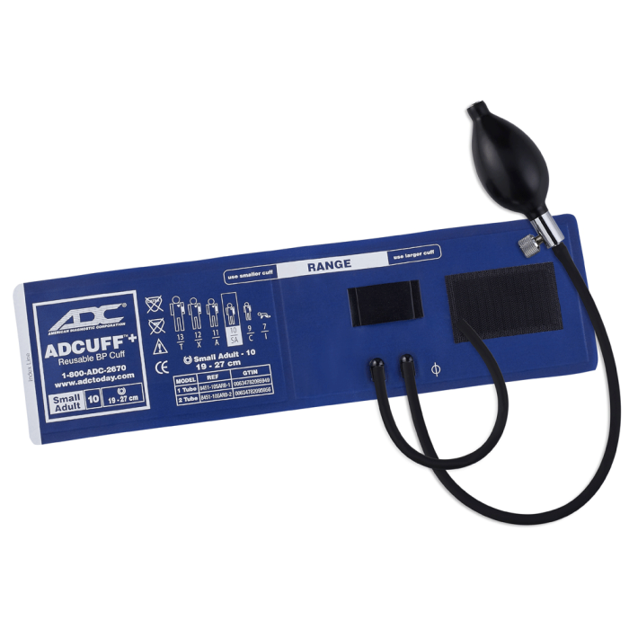 Adcuff sphyg inflation system can be used with most clock aneroids and mercurial instruments. The Adcuff+ model comes with two tubes and an Adflow bulb and valve, and features our all-new, one-piece, reusable nylon blood pressure cuff: