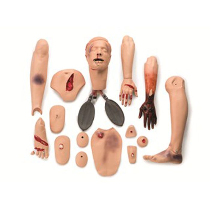 Advanced Trauma Module Set interchanges with blank modules on adult extrication manikins. Interchangeable modules include contusions, lacerations, fractures, burns, entry/exit wounds, head trauma, impaled objects and exposed viscera. Click here for a complete listing of modules included. Includes: Trauma Module Set and Directions for Use