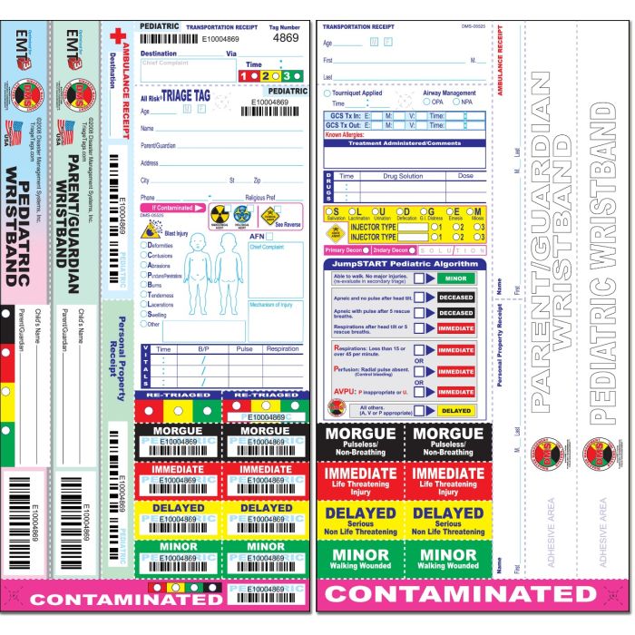 This is our Synthetic Paper All Risk(R) Pediatric Triage Tag with the added benefit of 2 bar-coded wristbands; one for the patient, and one for the parent or guardian. This NEW All Risk® Dual Wristband Pediatric Triage Tag from DMS features a JumpSTART Pediatric MCI Triage prompter on the back.