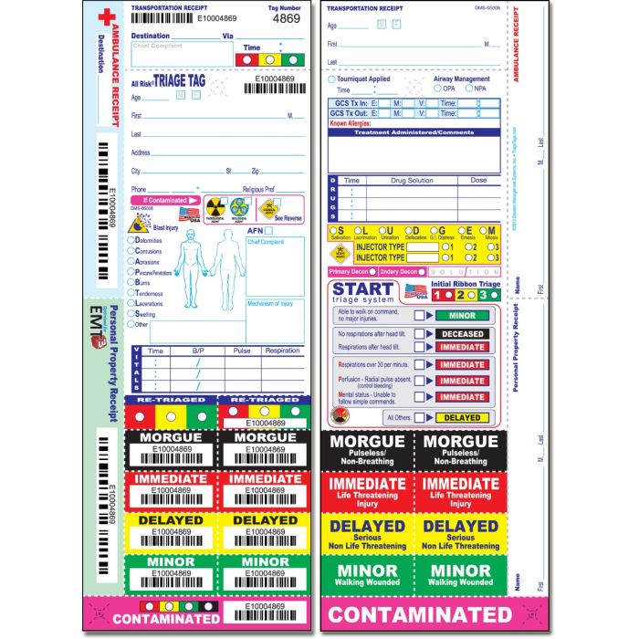 First responders are facing challenges never before imagined. The once unthinkable threat of radiological, biological or chemical contamination of our civilian population is now a reality. To successfully manage these incidents new strategies and tactics must be developed. The triage tag developed by Disaster Management Systems provides first responders with a tool to identify, process, and triage contaminated patients. The tag also provides rescue personnel with a means to tag and identify clothing and other personal property.