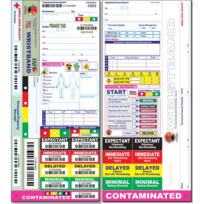 The EMT3 Optimized All Risk®; Wristband Triage Tag is specifically engineered as an integral part of the new EMT3 (Enhanced Method of Triage, Treatment and Transportation) System. It features updates such as a larger, more detailed Transportation Receipt, an added Ambulance receipt, and a repositioned Contamination strip now located at the bottom of the tag. This forces determination as to whether patient is contaminated or not before triage. We've added a Red/Yellow/Green RE-TRIAGED check circle receipt above Morgue making it possible to downward triage without deploying a second triage tag. We have also added a shortened tag number for easier radio transmission. Other new features include: • Blast Injury indicator • Tourniquet Applied • Airway Management (OPA/NPA) • Glasgow Coma Scale Indicator • Known Allergies area NOTE: Florida Version uses the term "EXPECTANT" rather than "MORGUE" NOTE: Military Version uses the terms "EXPECTANT" rather than "MORGUE" and "MINIMAL" rather than "MINOR" IMPORTANT: For all tags that utilize adhesive strips on wristbands, adhesive manufacturer recommends replacing tags every 2 years to ensure adequate adhesion.