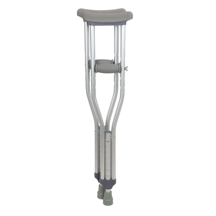 Dynarex Aluminum Crutches are durable mobility aids designed for a wide range of users. The crutches are ideal for either long or short-term use and feature convenient push-button height adjustment, cushioned underarm pads, and comfortable hand grips. Sturdy aluminum construction offers a reliable mobility option for both child and adult users.