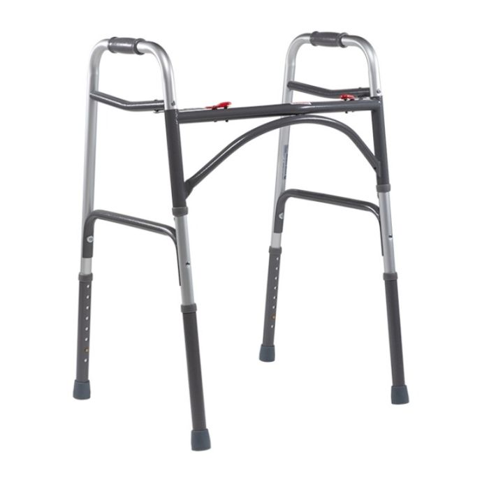 The Dynarex Bari+Max Dual Release Folding Walker is constructed with a sturdy aluminum frame that is both lightweight and supportive. The easy-to-use push button mechanism allows for easy opening and closing with fingers or palms. The Walker features tool-free push-button height adjustment for easy customization and locking knob to help prevent rattling.