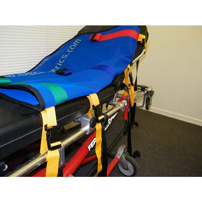 The BEAR Original is a nylon mesh coated in non-porous material which is UV resistant and chemical resistant. The device attaches to the side rail frame of the cot and prevents the huge abdominal mass from crossing the centerline of gravity thus preventing the ambulance cot from tipping. Some of our customers say our BEAR products are like wrapping people up like burritos.