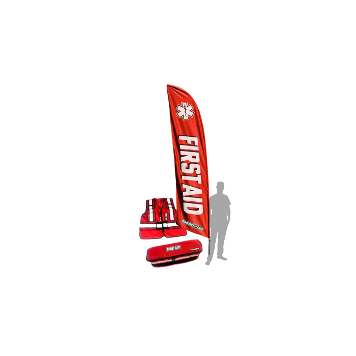 FIRST AID FLAG KIT |The tough, compact, ballistic bag contains the minimal products to quickly establish a highly visible FIRST AID area. The tall quick-deploy flag along with the red FIRST AID vest allows responders or civilians to identify the location of the First Aid area