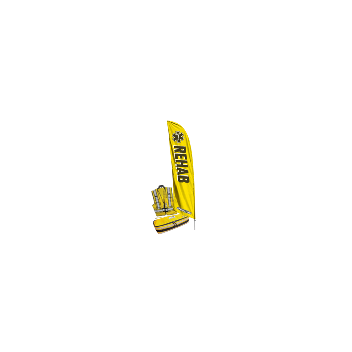 REHAB FLAG KIT |The tough, compact, ballistic bag contains the minimal products to quickly establish a highly visible REHAB area. The tall quick-deploy flag along with the yellow REHAB vest allows responders or volunteers to identify the location of the REHAB area