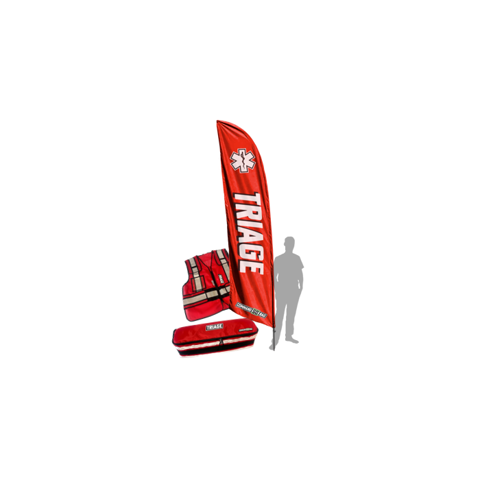 TRIAGE FLAG KIT |The tough, compact, ballistic bag contains the minimal products to quickly establish a highly visible TRIAGE area. The tall quick-deploy flag along with the red TRIAGE vest allows responders or civilians to identify the location of the Triage area