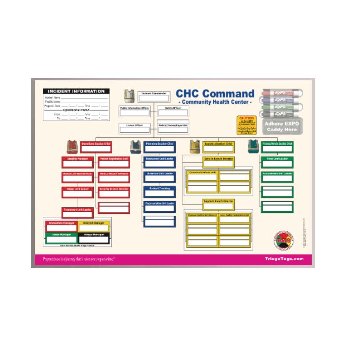 Sturdy Full Color Dry Erase (CHC) Community Health Center Command Board. This DMS-05522 Command Board is an essential companion piece to our DMS-05523 10 Position Community Health Center Command Vest Kit for Small Facility as well as our DMS-05524 - 31 Position Community Health Center vest Kit for Larger Facilities. A must for quick deployment of ICS positions.