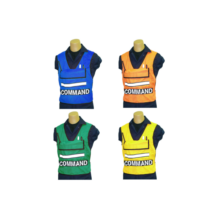 Build your own unified command system with our custom ICS vest service. Choose any of the titles below, on orange, blue, green or yellow vests. Each vest is built with strong 200D oxford nylon, and screened with cobalt white letters on a black background (better than reflective lettering at night). Each vest has Scotchlite™ stripes front and back, and sports a front pocket for notes and radio.