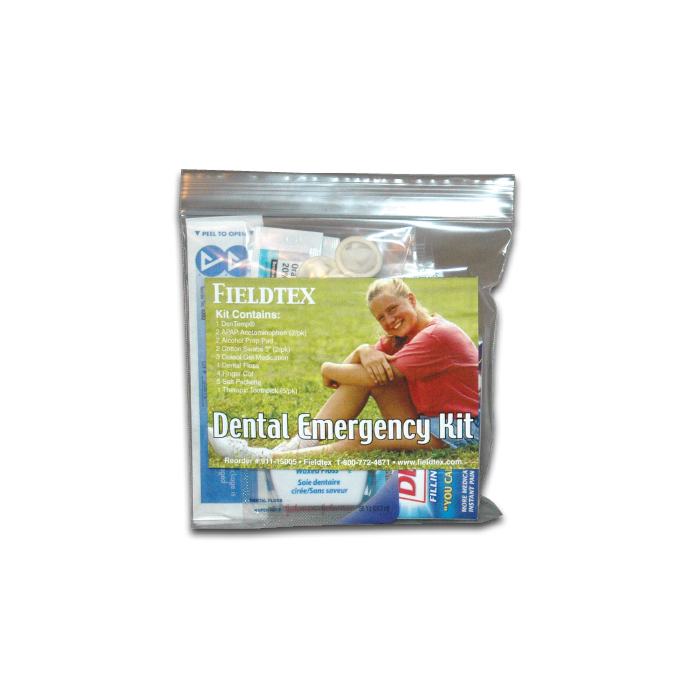 Our kit is compact and perfect for travelers, equipped with treatments for temporary toothache relief, loss of a filling, crown or cap, a tooth fracture, gum irritation, or oral sores.