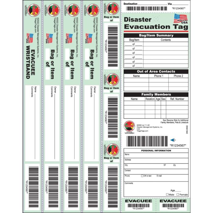 The DMS-05582 Disaster Evacuation Wristband Tag from DMS features a bar-coded evacuee wristband, 3 luggage tags with matching bar-codes, plus 3 stickers with matching bar-codes for application to bags or boxes.