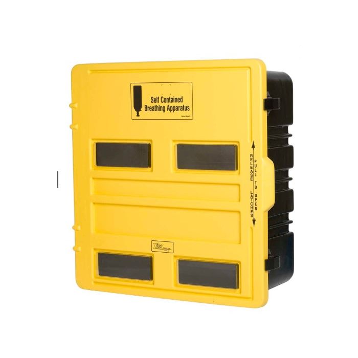 – Holds two air cylinders or SCBA air packs. Stick-on labels are provided to indicate minutes duration of SCBAs mounted inside.