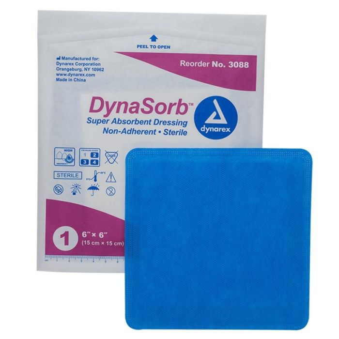 DynaSorb Super Absorbent Dressing is a multi-layered, one-piece dressing available as non-adherent or self-adherent with a contact layer and waterproof backing to prevent contamination. These dressings are constructed to facilitate the management of moderate to high levels of exudate to promote faster healing. The super absorbent core rapidly absorbs wound exudate, locking it away, minimizing risk of maceration while supporting a moist wound environment.