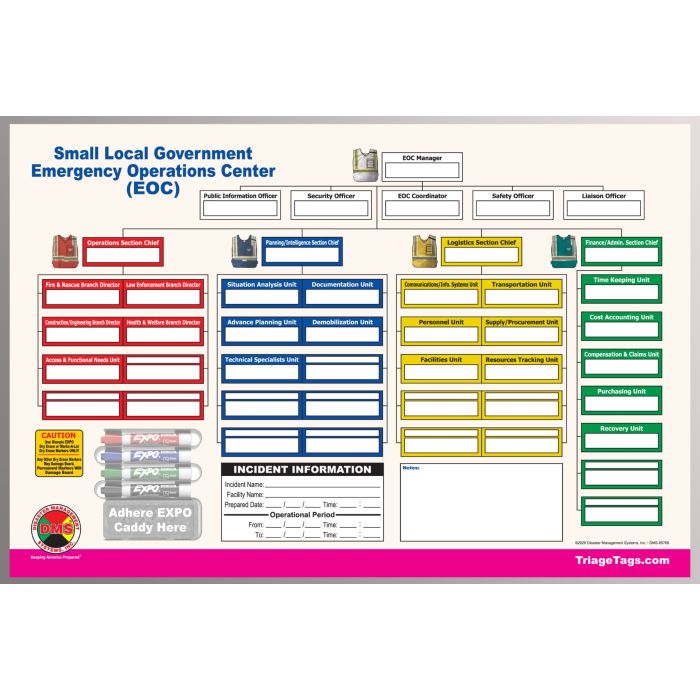 Sturdy Full Color Dry Erase EOC Command Board for Small Local Government. This DMS-05766 Command Board is an essential companion piece to our DMS-05756 31 Position EOC Vest Command Kit for Small Local Government. These command boards are a must for quick deployment of ICS positions.