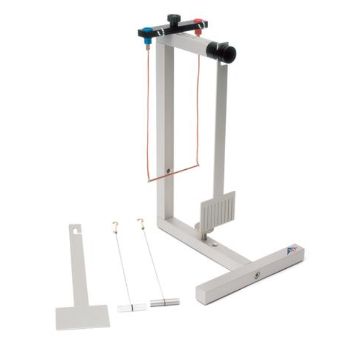 The Electromagnetic Experiment Set consists of a stable, anodized-aluminum tripod with pre-defined magnet positions and accessory mountings. The deflection of the conductor swing can be adjusted in steps of 0, 15, 30 and 45 mm for current balance experiments. All accessories can be fasted to the stand for easy storage.