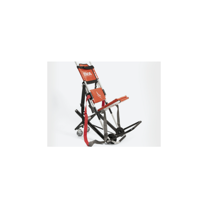 Ethos Evacuation Chair - 400 lb. rating. Stairway descending chair with 4" rugged rear wheels with brake, front and rear carry handles, cushioned seat, wall brackets, and dust cover.