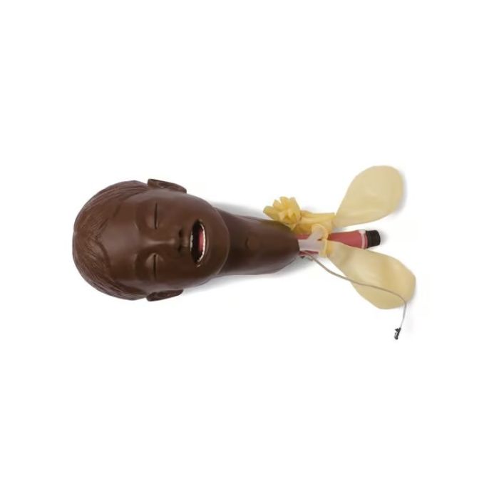 Pediatric head in brown skin tone with sounds speaker and trach opening to fit the Nursing Kid SimPad Capable manikin. Head is complete with lungs, pulse bulb and tubing, and a trach plug.