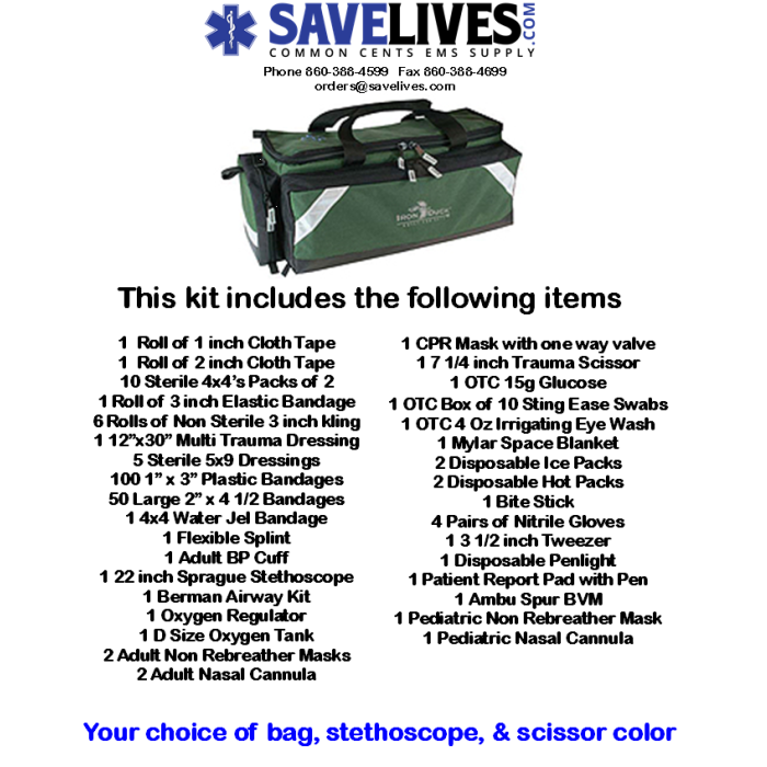Medical Supplies Included in this kit: 1 Roll of 1 inch cloth tape, 1 roll of 2 inch cloth tape, 10 sterile 4x4’s packs of 2, 1 roll of 3 inch elastic bandage, 6 rolls of non sterile 3 inch kling, 1 12” x 30” multi trauma dressing, 5 sterile 5x9 dressings, 100 1” x 3” plastic bandages, 50 large 2” x 4 ½” bandages, 1 4x4 water jel bandage, 1 flexible splint, 1 adult BP Buff, 1 22 inch Sprague stethoscope, 1 berman airway kit, 1 oxygen regulator, 1 D size oxygen tank *EMPTY*, 2 adult non rebreather masks, 2 adult nasal cannula, 1 CPR Mask with one way valve, 1 7 ¼ inch trauma scissor, 1 OTC 15g glucose, 1 OTC box of 10 ammonia inhalants, 1 OTC box of sting ease swabs, 1 OTC 4 oz irrigating eye wash, 1 mylar space blanket, 2 disposable ice packs, 2 disposable hot packs, 1 bite stick, 4 pairs of nitrile gloves, 1 3 ½ inch tweezer, 1 disposable penlight, 1 patient report pad with pen, 1 ambu spur BVM, 1 pediatric non rebreather mask, 1 pediatric nasal cannula.