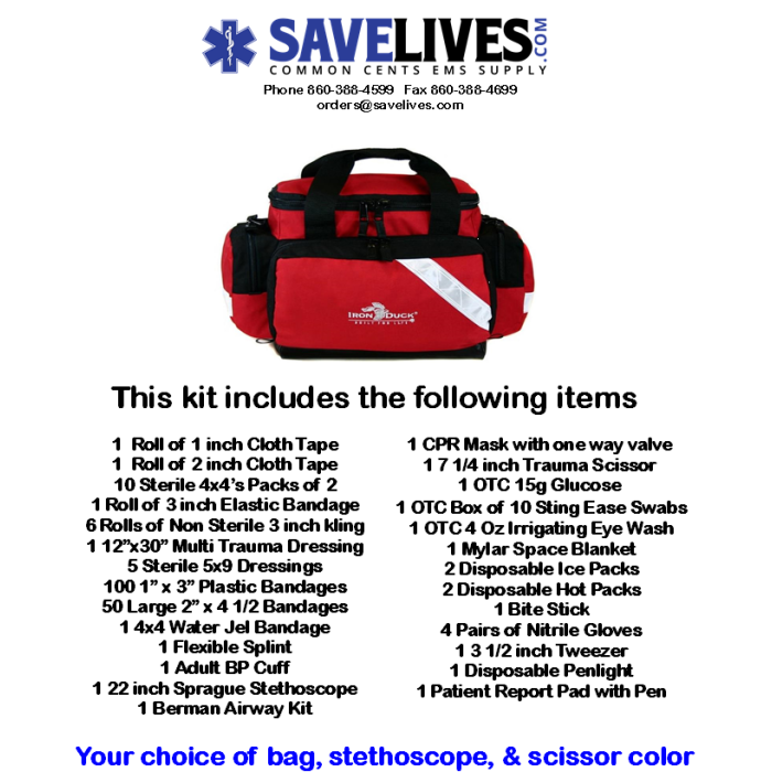 * * This bag comes full of supplies * * Medical Supplies Included in this kit: 1 Roll of 1 inch cloth tape, 1 roll of 2 inch cloth tape, 10 sterile 4x4’s packs of 2, 1 roll of 3 inch elastic bandage, 6 rolls of non sterile 3 inch kling, 1 12” x 30” multi trauma dressing, 5 sterile 5x9 dressings, 100 1” x 3” plastic bandages, 50 large 2” x 4 ½” bandages, 1 4x4 water jel bandage, 1 flexible splint, 1 adult BP Buff, 1 22 inch Sprague stethoscope, 1 berman airway kit, 1 CPR Mask with one way valve, 1 7 ¼ inch trauma scissor, 1 OTC 15g glucose, 1 OTC box of 10 ammonia inhalants, 1 OTC box of sting ease swabs, 1 OTC 4 oz irrigating eye wash, 1 mylar space blanket, 2 disposable ice packs, 2 disposable hot packs, 1 bite stick, 4 pairs of nitrile gloves, 1 3 ½ inch tweezer, 1 disposable penlight, 1 patient report pad with pen.