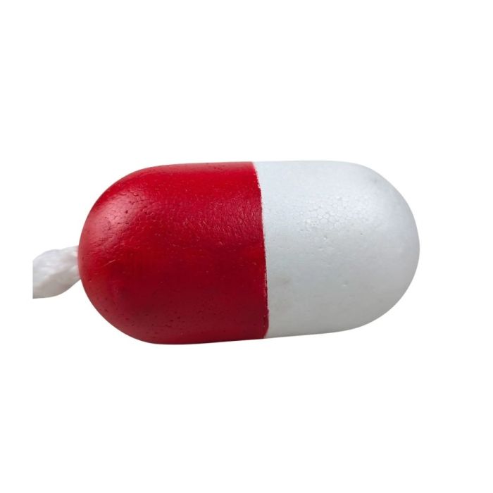 The Kemp USA Pool Rope Float, measuring 3x5 inches and featuring a red and white split design. Made to slide or string onto ropes or nets, making it ideal for delineating swim zones or boundary markers. Constructed from a durable foam, accommodates ropes with a diameter of up to 3/8 inch, and easy to see.