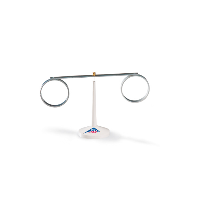 Instrument for demonstrating Lenz’s Law qualitatively by bringing a magnet close to it. One closed and one open conductor loop, with point bearing on base.