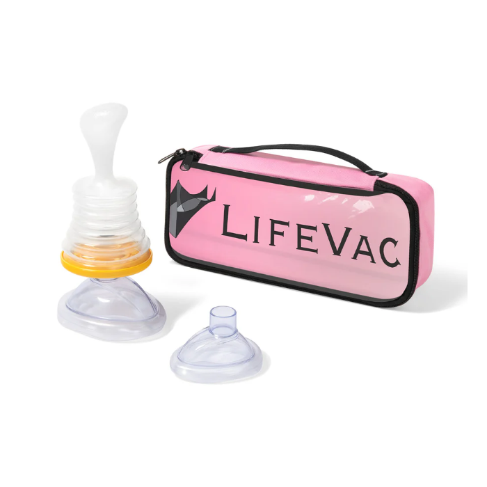 LifeVac is a simple, safe, and effective choking rescue device that can help save a life in the event of a choking emergency. The Travel Kit provides customers with both an adult and pediatric mask. Designed for easy access on the go, the pink Travel Kit comes in a zip-up bag—perfect for keeping in your car, luggage, or diaper bag.