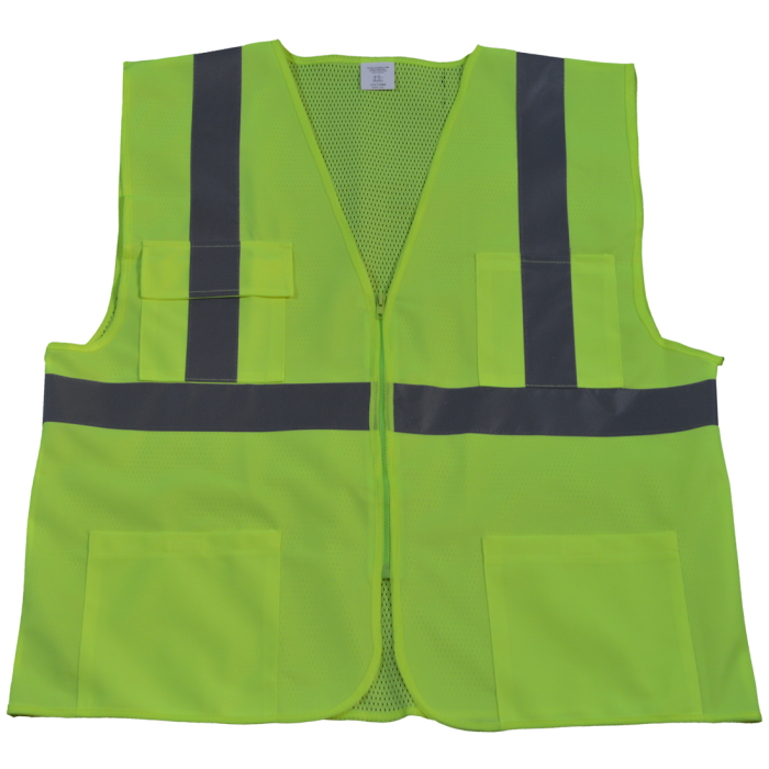 Meets ANSI/ISEA 107 Class II Standard 2” silver reflective tapes Zipper front closure (2) Chest Pockets (3-div and pad pocket) (2) bottom pockets (HxW: 7"x7") Sizes available: S/M, L/XL, 2X/3X, 4X/5X