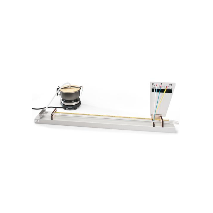 Apparatus for measuring the linear expansion of different kinds of solids simultaneously. The set includes three sample tubes (steel, aluminium and glass) which are heated by passing steam through them. Linear expansion is indicated on a mirror scale by three differently coloured pointers mounted on rollers. Includes silicone tubing.