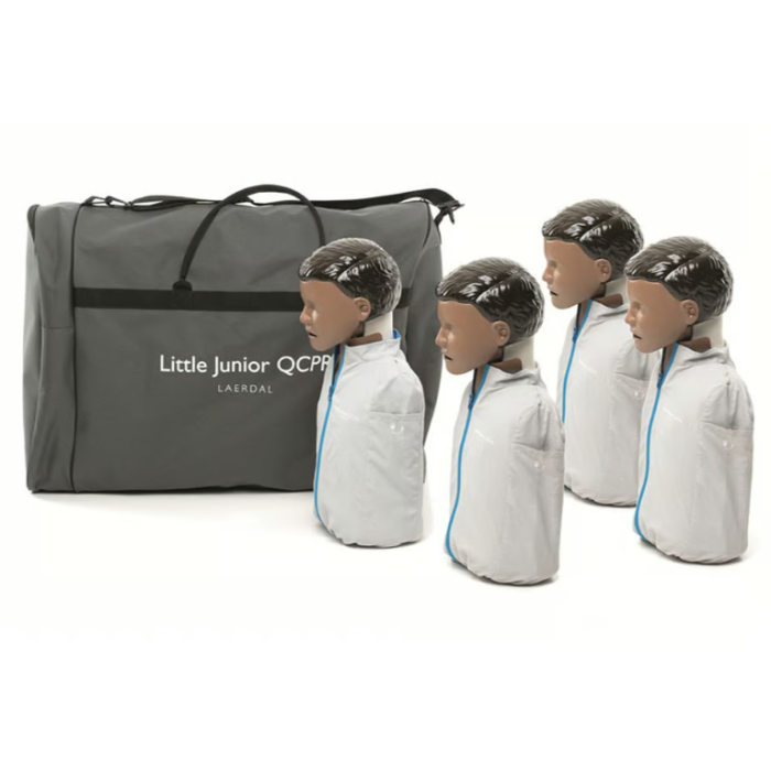 Little Junior QCPR is available in light or dark skin tones and as a single manikin or a convenient 4-pack. Make your skin tone and quantity selections by using the drop-down boxes above. Includes: Little Junior QCPR Manikins, carry case/training mat (4-pack includes 4 training mats and large carry case). Each manikin includes 2 Manikin Faces, 2 Little Anne Airways, 6 Manikin Wipes, and Directions for Use. SkillGuide sold separately.