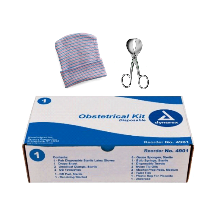 Emergency disposable obstetrical kit includes: · 1 pair sterile latex exam gloves · 3 packages of 2 sterile 4x4 gauze sponges (12 total) · underpad · 1 unbilical scissor · 1 sterile bulb syringe · 2 o.b. towelettes · 1 sterile o.b. pad · sterile umbilical clamps · 2 nylon tie-offs · 1 drape sheet · 2 alcohol preps, medium · 1 receiving blanket · 1 plastic bag to hold placenta · 4 disposable towels · 2 twist tie - Knit Beanie Cap.