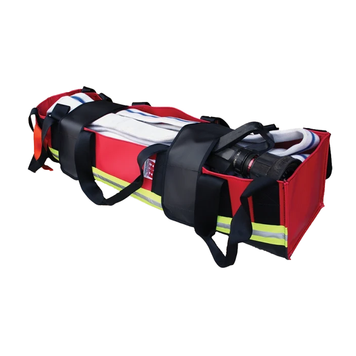 Milwaukee Strap Hose Packs. Constructed with firefighters in mind, this is made of durable 22 oz. reinforced vinyl. With double thickness inside, the bottom and ends keep your hose in an attack ready condition. Brass grommets allow water drainage and a Velcro® strap secures the contents on all of the packs. The Milwaukee Strap Hose Packs (#M/S HP, #M/S HP-36, and #m/s FO) have one end that opens so hose may be pulled out for easy hose lay. MILWAUKEE STRAP HOSE PACK - 36” #M/S-HP-36 Similar to the 50” Hose Pack, this pack has two Velcro® straps securing the contents and the pack holds up to 100’ of 1 1/2” or 1 3/4” hose. This is available in red and weighs 36 oz. The overall dimensions are 36”L x 8”W x 9”H.