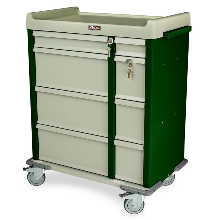 OptimAL(All Aluminum) Punch Card Cart with BEST® Lock on Cabinet. Illinois Lock on Narcotics Drawer. Capacity of 480 cards. Includes: Pull-out Shelf, Adjustable Punch Card Row Dividers and Locking Narcotics Box. Dual Column Cart-Single Wide Narcotics Drawer. Specialty Package Includes #68630-P1 Drawer Tray with Dividers, #680551 Small Drawer Divider Set, #AL680436 Waste Container with Lid, and #684810 Locking Sharps Container.