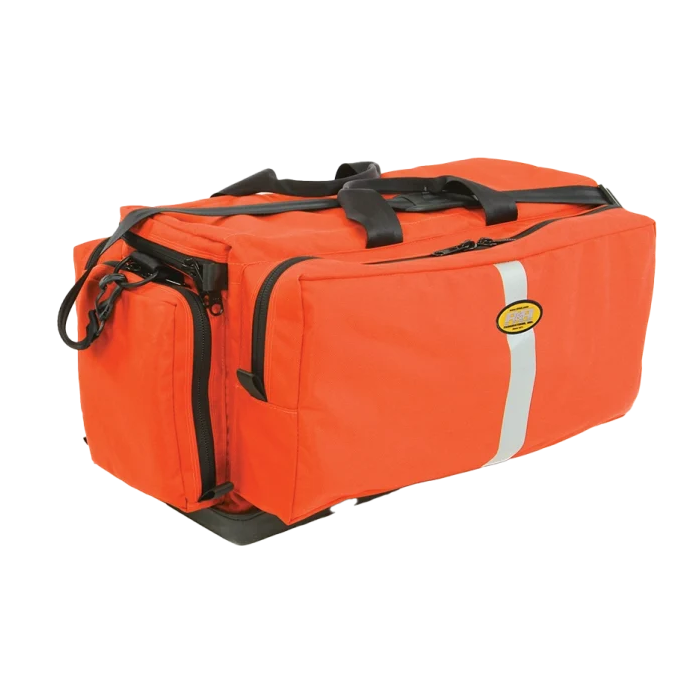 Mega Medic’s bag The outer shell is constructed of Cordura® nylon. Four interior options make these bags extremely customizable. Choose from a fully padded insert with adjustable dividers, a padded insert with oxygen tank straps and pouch pockets, a “Z” Pak removable storage insert, or keep the main compartment empty. All insert options may be removed for cleaning. The bag is designed to hold a “D” or Jumbo “D” oxygen cylinder, with access to the regulator through the end pocket. The Tuff Bottom provides an almost indestructible base. Four outside pockets surround the main compartment. There are two pockets on the front that have multiple elastic loops and slot pockets. Inside the lid is a large zippered pocket. #10YKK heavy duty nylon zippers are used throughout the bag and are reversed to eliminate wear on the coil, therefore prolonging the life of the strongest zipper on the market. It comes with an adjustable nylon shoulder strap. Available color choices are: red, orange, and royal blue. It weighs 130 oz. and has overall dimensions of 27”L x 15”W x 12”H.