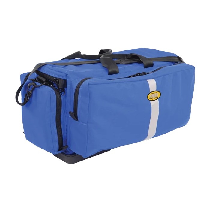 Mega Medic’s Vinyl Bag. #RB A600x-RB-VINYL #RB A600x-RB-VINYL-A Empty main compartment #RB A600x-RB-VINYL-B Adjustable dividers #RB A600x-RB-VINYL-C Tank strap dividers to hold “D” or Jumbo “D” cylinder. #RB A600x-RB-VINYL-D “Z” PAK insert It’s the highest quality impervious trauma/oxygen bag on the market. The outer shell is constructed of 22 oz. vinyl. The interior liner is constructed of nylon pack cloth and high density foam for equipment protection and stability. The dividers are fully adjustable and secured in place with hook and loop. Both the dividers and the liner may be removed for cleaning by hand washing with mild soap and water and then allowing it to air dry. This bag will hold a “D” or Jumbo “D” oxygen cylinder with access to the regulator through the end pocket. The Tuff Bottom provides an almost indestructible base. Four outside pockets surround the main compartment. There are two pockets on the front that feature multiple elastic loops and slot pockets. Inside the lid is a large zippered pocket. #10YKK heavy duty zippers are used throughout the bag and are reversed to eliminate wear on the coil therefore prolonging the life of the strongest zipper on the market. It comes with an adjustable nylon shoulder strap. It is available in royal blue, with a weight of 140 oz. and overall dimensions of 27”L x 15”W x 12”H.