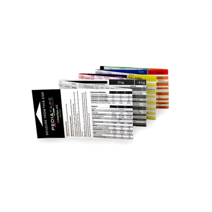 Pediatape is a color-coded pediatric emergency tape for EMS providers, hospitals, nurses and paramedics. Quickly measure length and estimate weight with industry-standard color codes. Get exact mLs for the most common resuscitation medication concentrations. Pediatape is more compatible with the Broselow system than competing products - including medications, equipment, color coding, lengths and dosing. Equipment settings are more comprehensive and easier to read as well. Color lengths are based on the US CDC NHANES Data Set. Made with durable synthetic paper.