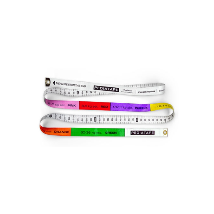 Color-coded pediatric emergency tape. Quickly measure length and estimate weight with industry-standard color codes. Lengths based on the US CDC NHANES Data Set and compatible with the 2019 Broselow TapeTM. Washable and durable (coated fiberglass).