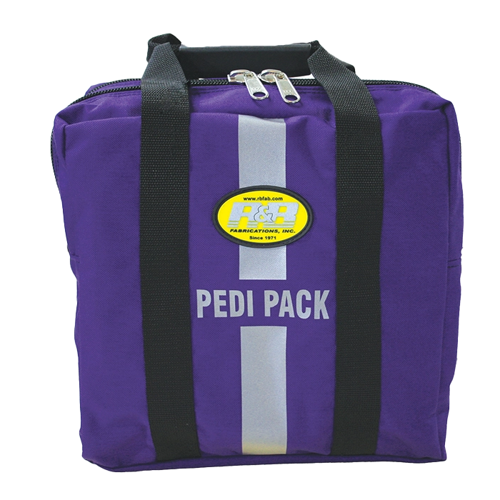 PEDI PACK #RB 829-PURPLE Be prepared when dealing with pediatric emergencies. This compact pediatric pack keeps all the equipment needed for pediatric emergencies organized without the needless repetition of supplies. The outside front pocket has ample room for a child BVM and a 1,000cc IV pack and is stored without crushing the equipment. The double self healing zippers allow easy access to the interior which has an abundance of storage for advanced and basic supplies. Elastic straps hold the intubation equipment. A standing divider, with nylon pockets, holds items ranging from pediatric size guides to oxygen supplies. The quick release handles allow the bag to be opened and closed quickly therefore securing equipment even with the zippers unzipped. It is constructed of tough Cordura® nylon and reflective trim. The back of the pack is made of heavy vinyl assuring durability and easy cleaning. The advantages of this pack include being lightweight and offering organization unlike other packs. This comes in purple and has a total area of 1,183 cubic inches. It weighs 40 oz. and has overall dimensions of 13”L x 6 1/2”W x 14”H.
