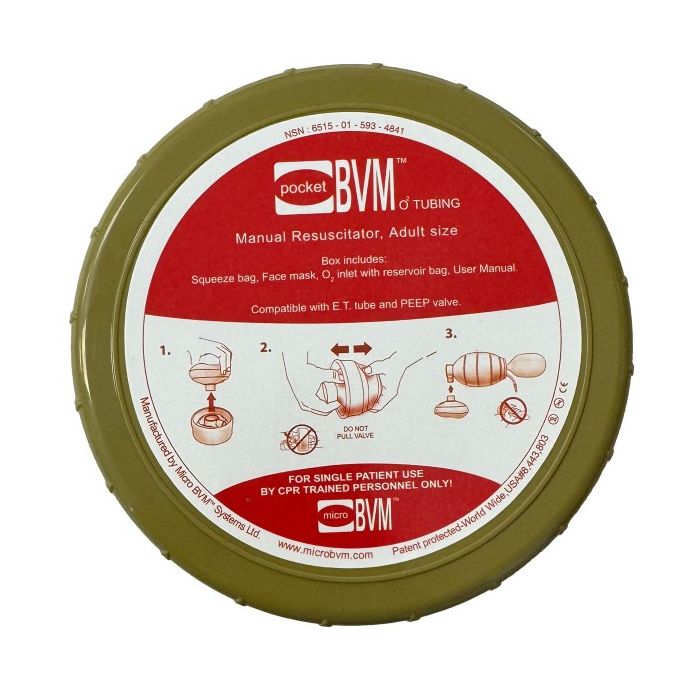 The Pocket BVM® is todays most compact, easy-to-use BVM available to provide ventilatory support to patients who are not breathing or who are in respiratory distress. Its unique collapsible design is quick-to-deploy, easy-to-operate and does not need to be manually inflated prior to use. To help reduce rescuer fatigue, this BVM requires minimum pressure for compression of the bag to ventilate and quickly recovers its shape during use. Packaged in a rugged, hard plastic, twist-top case, it comes complete with oxygen tubing for delivering supplemental oxygen when possible.