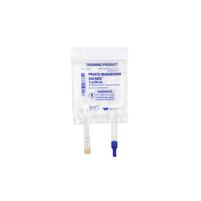 Practi-Magnesium Sulfate™ 50 mL IV Solution Bag for clinical training, simulates 2 g/50 mL (premixed) Magnesium Sulfate™ in a 50 mL IV Solution Bag.