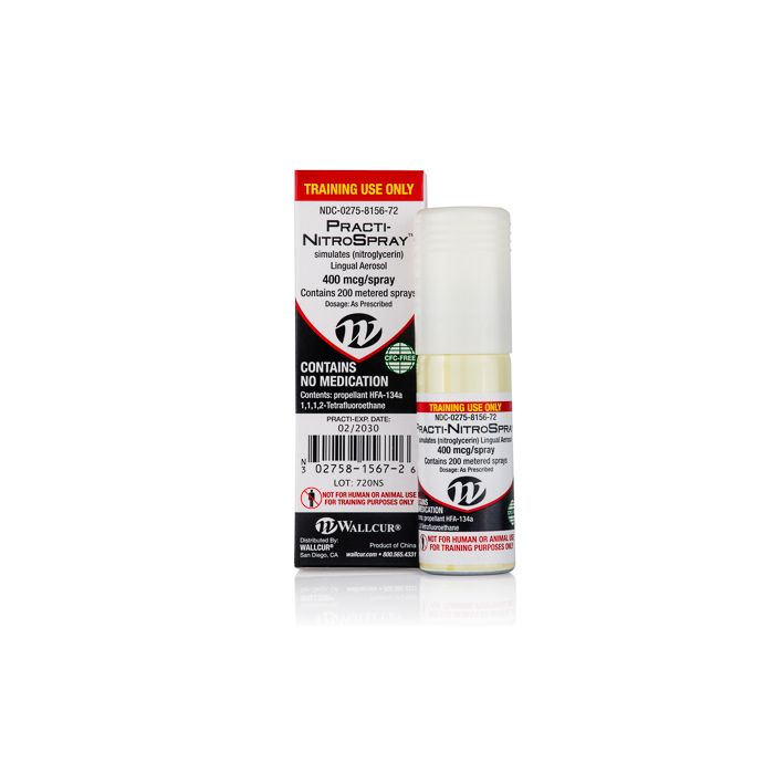 Practi-NitroSpray™ is a CFC free pump that simulates a sublingual aerosol spray. Labeled identical to its true drug counterpart, nitroglycerin, which is used to treat episodes of angina in people who have coronary artery disease. Each spray pump looks, acts, and feels like the real thing! Contains no medication and provides 200 sprays per pump. Practi-Nitroglycerin Spray™ is a helpful and effective addition to your current patient care scenarios.