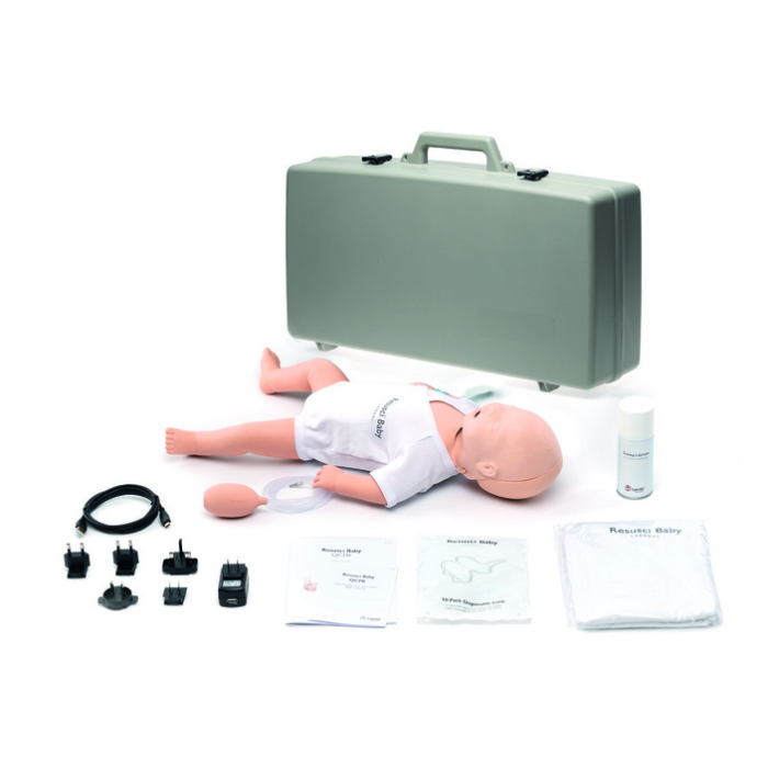 Pulse bulb, Training lubricant, 10 pkg disposable lungs, 5V USB Wall Adapter, USB C to A cable for charging manikin, Resusci Baby Blanket, QCPR armband, User Guide and IPI