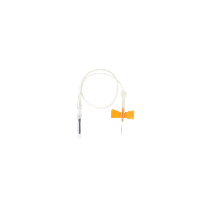 - Winged blood-collection needle bonded to transparent tubing with luer connector