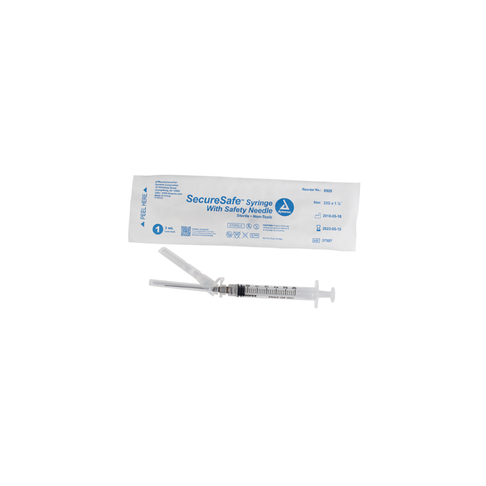 The Dynarex SecureSafe Syringes with Safety Needle are designed with a safety engineered mechanism to provide a comfortable, effective way to deliver medication or draw blood, while protecting the users from accidental needlesticks.